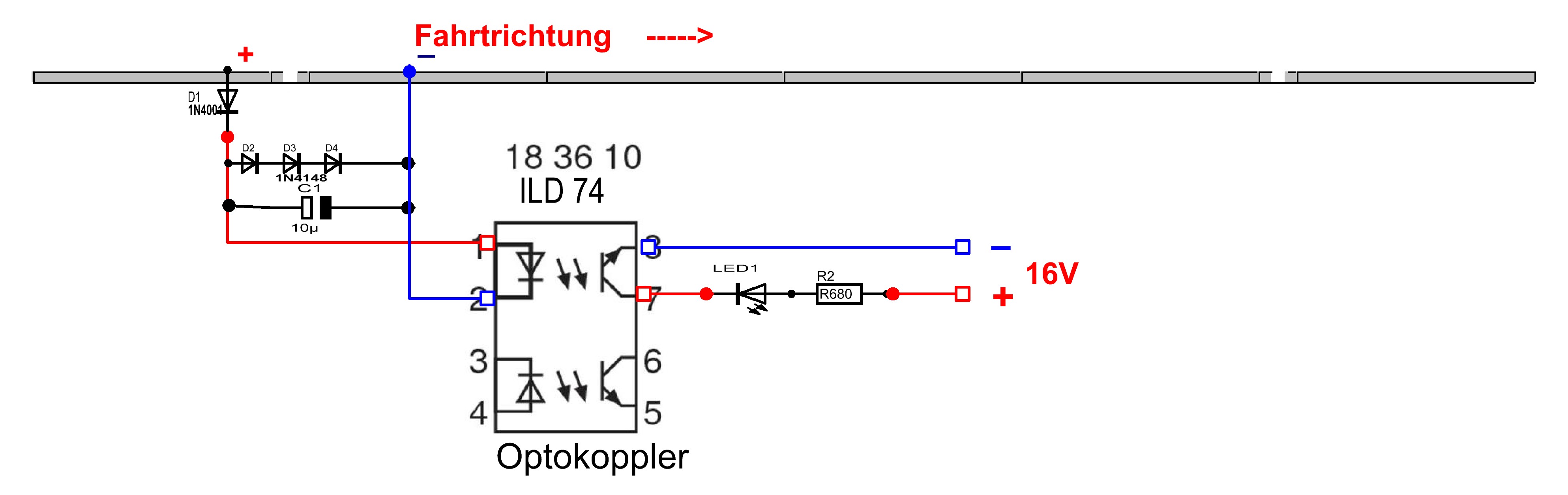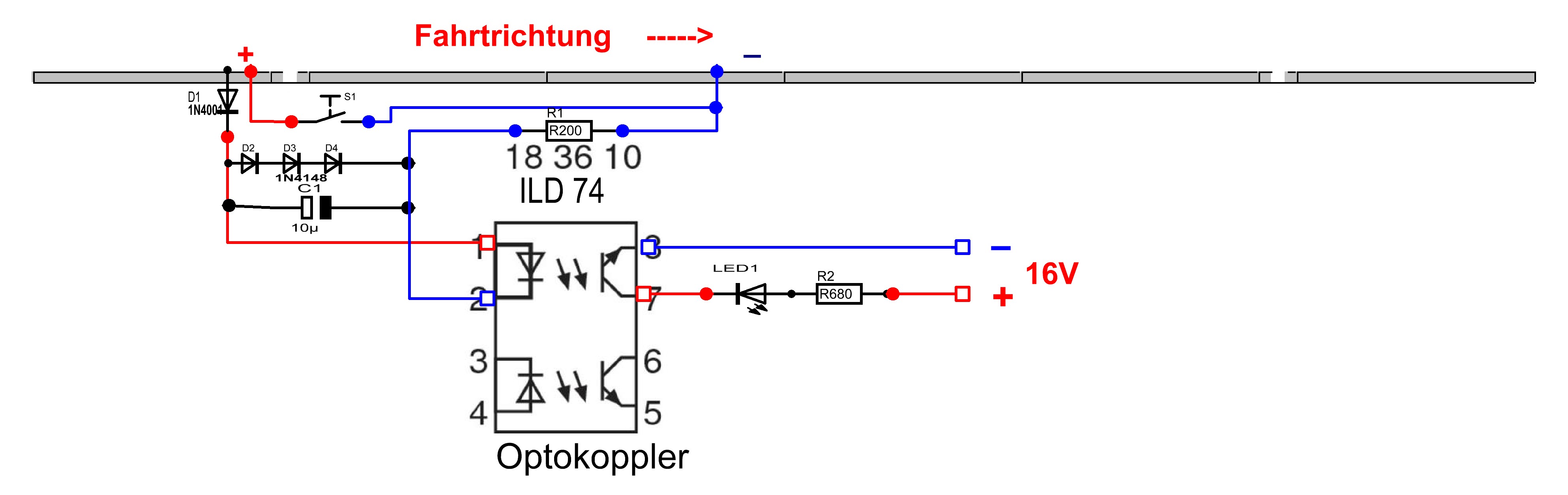Den Drucktaster wird für die ober Schaltung verwendet. Da der Zug in diesem Abschnitt zum Halten kommt, muss der Druckschalter betätigt werden damit der Zug weiter fahren kann.